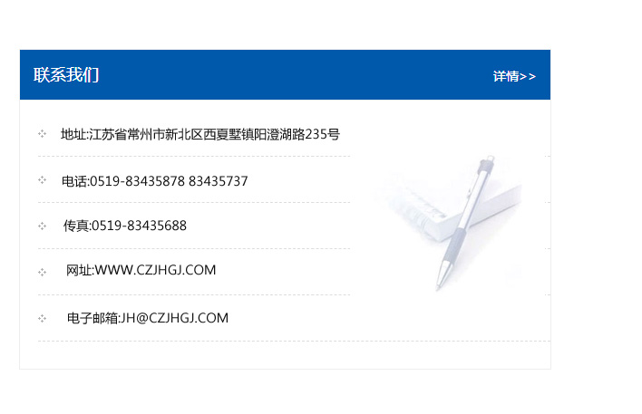 地址:常州市新北區友邦商務大廈1幢16、17層  電話:0519-85101652  傳真:0519-85112595  郵編:213022  網址:www.cz-jiayue_cn.xygmjg.com  郵箱:xiajifengaa@163.com